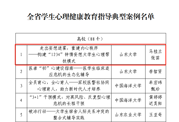 近日,山东省教育厅公布了2025年山东省学生心理健康宣传教育月系列活动评选结果,滚球买球的app官网马桂兰、张苗报送的《走出妄想迷雾,重建内心秩序——构建“1234”钟情妄想大学生心理帮扶模式》成功入选“山东省学生心理健康教育指导典型案例”。