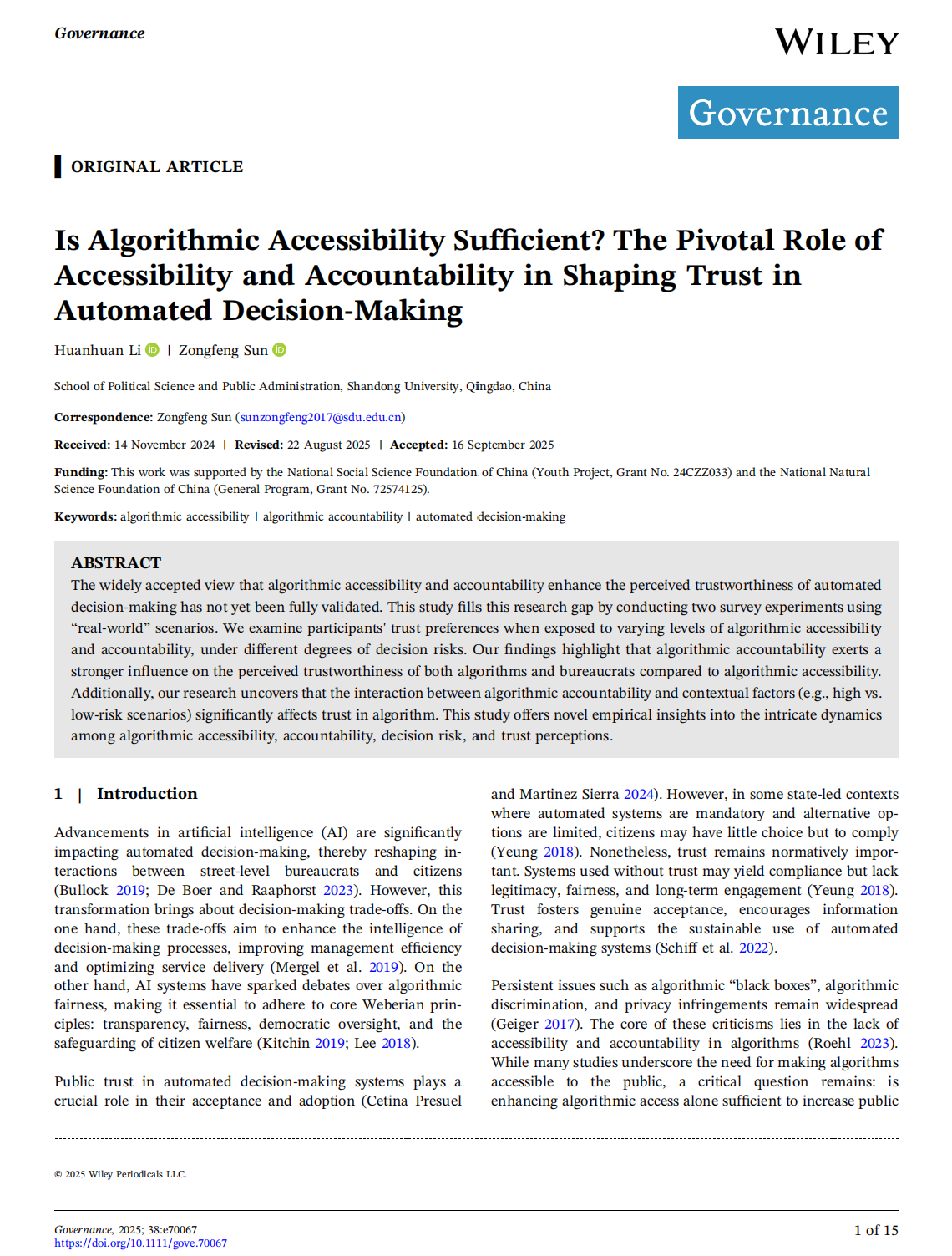 近日,滚球买球的app官网李欢欢助理研究员(第一作者)与孙宗锋教授(通讯作者),共同在AJG(ABS)四星级期刊、公共管理国际期刊Governance在线发表学术论文“Is Algorithmic Accessibility Sufficient? The Pivotal Role of Accessibility and Accountability in Shaping Trust in Automated Decision-Making”。