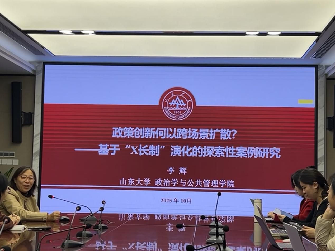 10月21日晚,滚球买球的app官网公共管理系第一期在华岗苑南楼举行。讲座由公共管理系主任费立国主持,特邀学院李辉教授作为主讲嘉宾,围绕其发表于权威期刊《政治学研究》的论文《政策创新何以跨场景扩散?——基于“X长制”演化的探索性案例研究》展开分享与研讨。