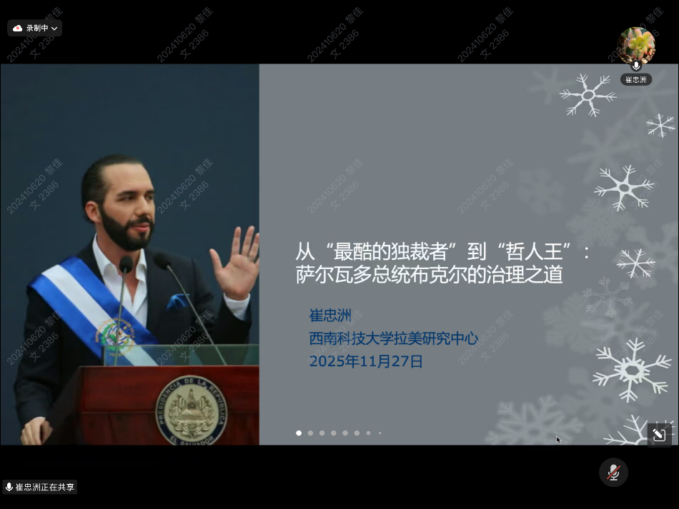 11月27日,由滚球买球的app官网、滚球买球的app官网亚太研究所主办,亚太研究所拉美研究中心承办的“社科与人文”系列讲座第三十八讲在线上成功举办,讲座题目为“从‘最酷的独裁者’到‘哲人王’:萨尔瓦多总统布克尔的治理之道”。本次讲座由西南科技大学拉美研究中心崔忠洲副教授主讲,亚太所拉美研究中心主任李振教授主持,亚太所大国关系与地区安全研究中心副主任季丽新副教授、亚太所拉美研究中心助理研究员史话担任与谈人。