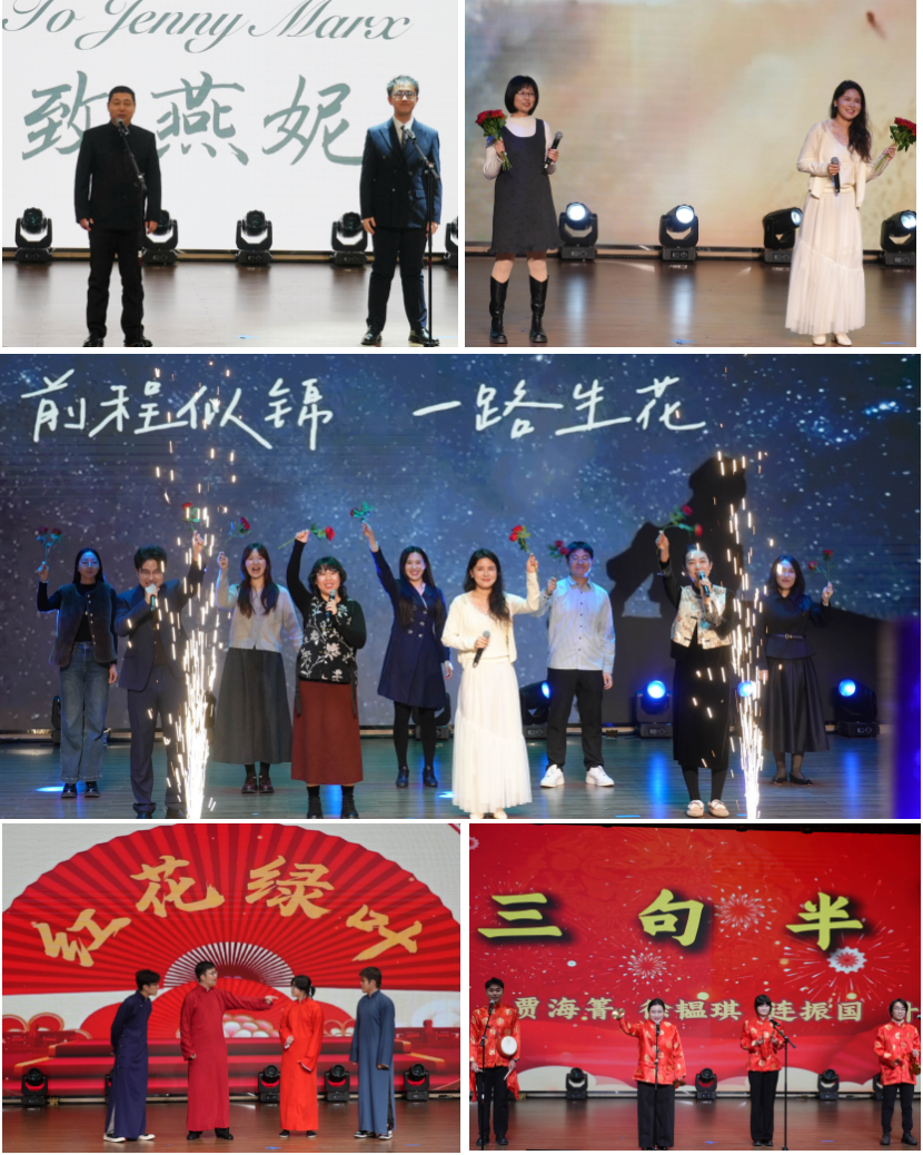 本场晚会共分为 “驰途志学:跬步千里,厚积薄发”“骁骥担当:明辨笃行,经世致用”“骅风浩荡:家国天下,共谱新篇” 三个篇章,演出内容涵盖歌曲、舞蹈、相声、诗朗诵、弹唱等多种形式,为现场观众呈现了一场精彩纷呈的视听盛宴。在第一篇章中,三句半《政管青年颂新元》以诙谐锣鼓碰撞时代强音,奏响青春与家国的和鸣;教师对唱《隐形的翅膀》旋律轻盈、寓意坚定,勾勒出承载希望的精神天空;群口相声《红花绿叶》妙趣横生,在“捧逗之争” 中尽显传统艺术魅力;师生诗朗诵《致燕妮 十四行诗》深情款款,让观众在经典中感受真理与精神的力量;教师合唱《一路生花》满含期许,诉说着对学子的美好祝愿。