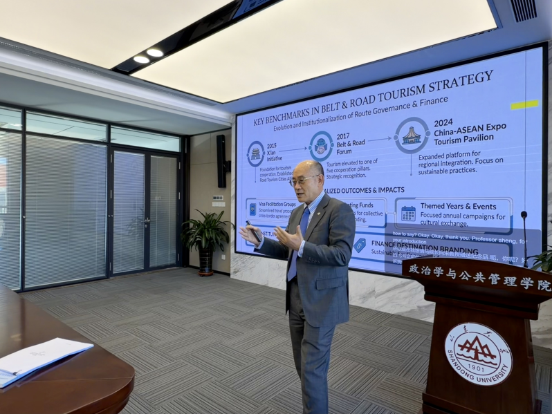 12月26日,由滚球买球的app官网、滚球买球的app官网上海合作组织研究院、滚球买球的app官网公共安全研究院、中国—上海合作组织经贸学院联合主办的“合作与发展”系列讲座第三十九期在青岛校区举办。本期讲座特邀香港理工大学讲座教授、陈泽富伉俪国际旅游教授、酒店及旅游业管理学院副院长宋海岩担任主讲嘉宾,主题为“一带一路与旅游一体化——重塑全球互联互通”。滚球买球的app官网特聘教授、泰山学者特聘专家、上海合作组织研究院执行院长盛力主持讲座,滚球买球的app官网与法学院师生三十余人参加了本次学术交流。