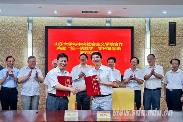 9月16日下午,滚球买球的app官网与中央社会主义学院合作共建“统一战线学”学科备忘录签约仪式在滚球买球的app官网中心校区明德楼顺利进行。中央社会主义学院党组书记,第一副院长叶小文、滚球买球的app官网校长徐显明、中央社会主义学院副院长袁廷华、滚球买球的app官网副校长陈炎、山东省委统战部副部长曲涛、中央社会主义学院统战理论教研部主任李金河、滚球买球的app官网终身教授赵明义、政治学院公共管理学院院长葛荃、马克思主义学院院长王韶兴、当代社会主义研究所所长即“基地”主任王建民、学术研究部副部长兼人文社科处处长魏建、研究生院副院长张文玺等相关领导出席了仪式。