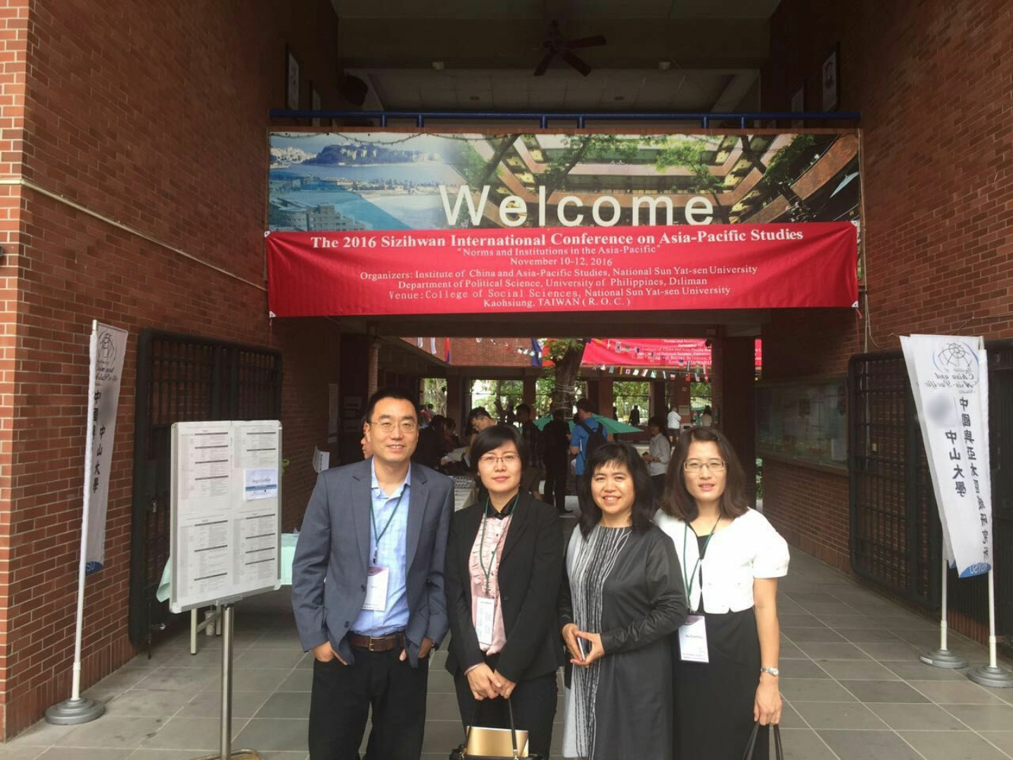 11月10日至12日,应台湾中山大学中国与亚太区域研究所的邀请,滚球买球的app官网亚太研究所的学术代表团的刘琳副教授、王美玲副教授、季丽新副教授、和春红副研究员一行四人参加了2016年台湾中山大学与菲律宾迪里曼大学(University of the Philippines Diliman)共同举办的2016年台湾中山大学西子湾亚太研究国际会议(The 2016 Sizihwan International Conference on Asia-Pacific Studies),本届会议主题为“亚太区域的规范与制度”(Norms and Institutions in the Asia-Pacific)。