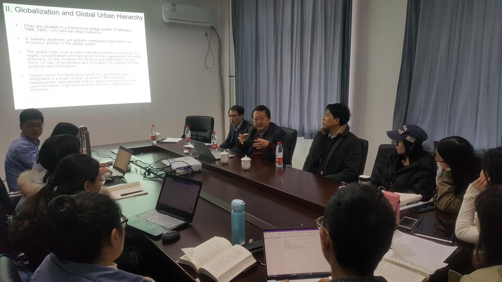 崔兴硕教授首先从当今的全球化与全球城市等级现象入题,他认为一些全球性城市,如纽约、伦敦,正在发挥着四个方面的功能:一是世界经济组织的指挥所;二是金融和专业服务公司的集散地;三是生产与创新场所;四是产品与创新市场。全球化推动着全球经济的增长,而在这一进程中处于不同等级的城市则扮演着不同的角色,处于同一等级中的城市变得越发相像,而与本国内的其他城市则越发的不同。另外,崔教授从金融、政治/意识、文化等多个方面阐释了成为全球大城市的必备条件。