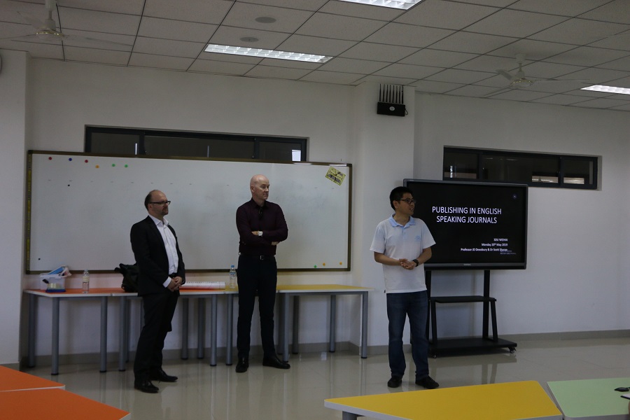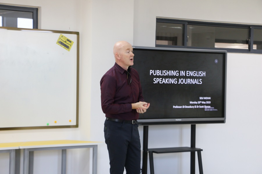 5月23日,John-David Dewsbury教授和Scott Sharpe博士应滚球买球的app官网的邀请,在青岛校区振声院西楼特色教室作了题为“如何在英语期刊发表论文:审核者关注什么?”的学术讲座,滚球买球的app官网县域发展研究院副院长段昊主持了讲座,吸引了滚球买球的app官网和其他相关专业的师生参加了此次讲座。