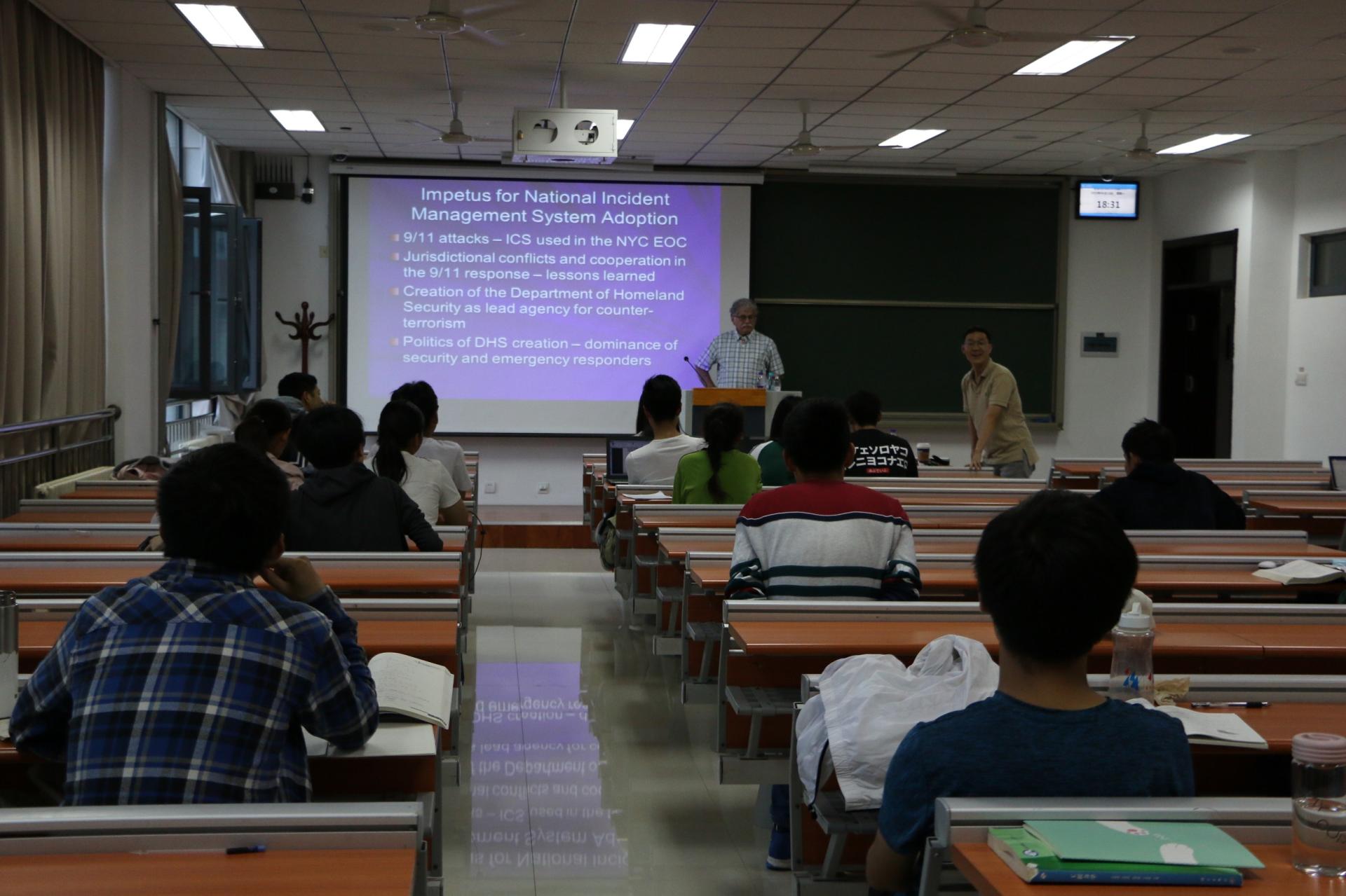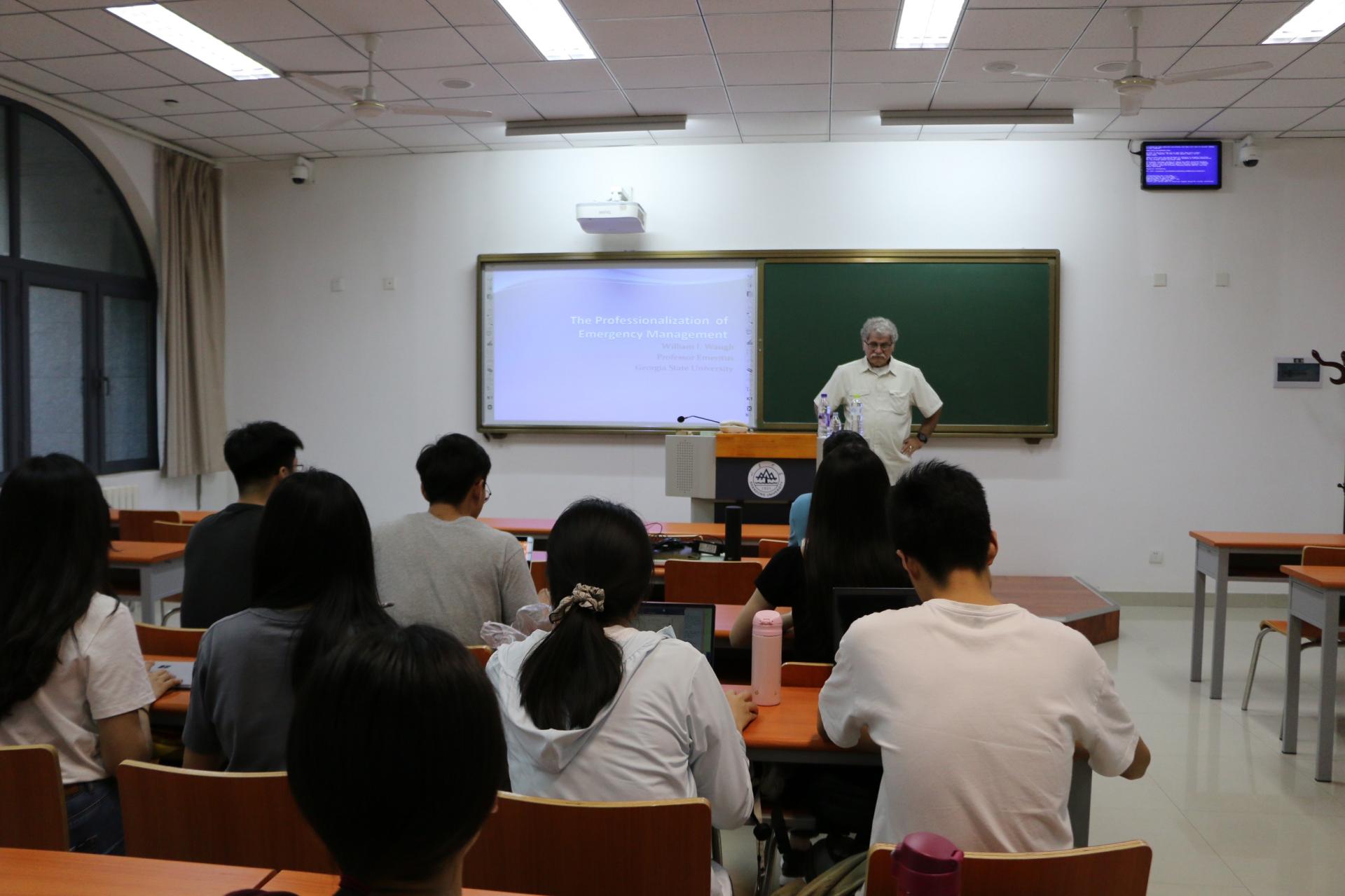 在为期10天的教学流动岗课程中,Waugh教授分别从应急准备与计划、危机事件管理与协作、应急管理的专业化和英文学术论文写作与发表等同学们感兴趣的内容进行主题课程讲授。
