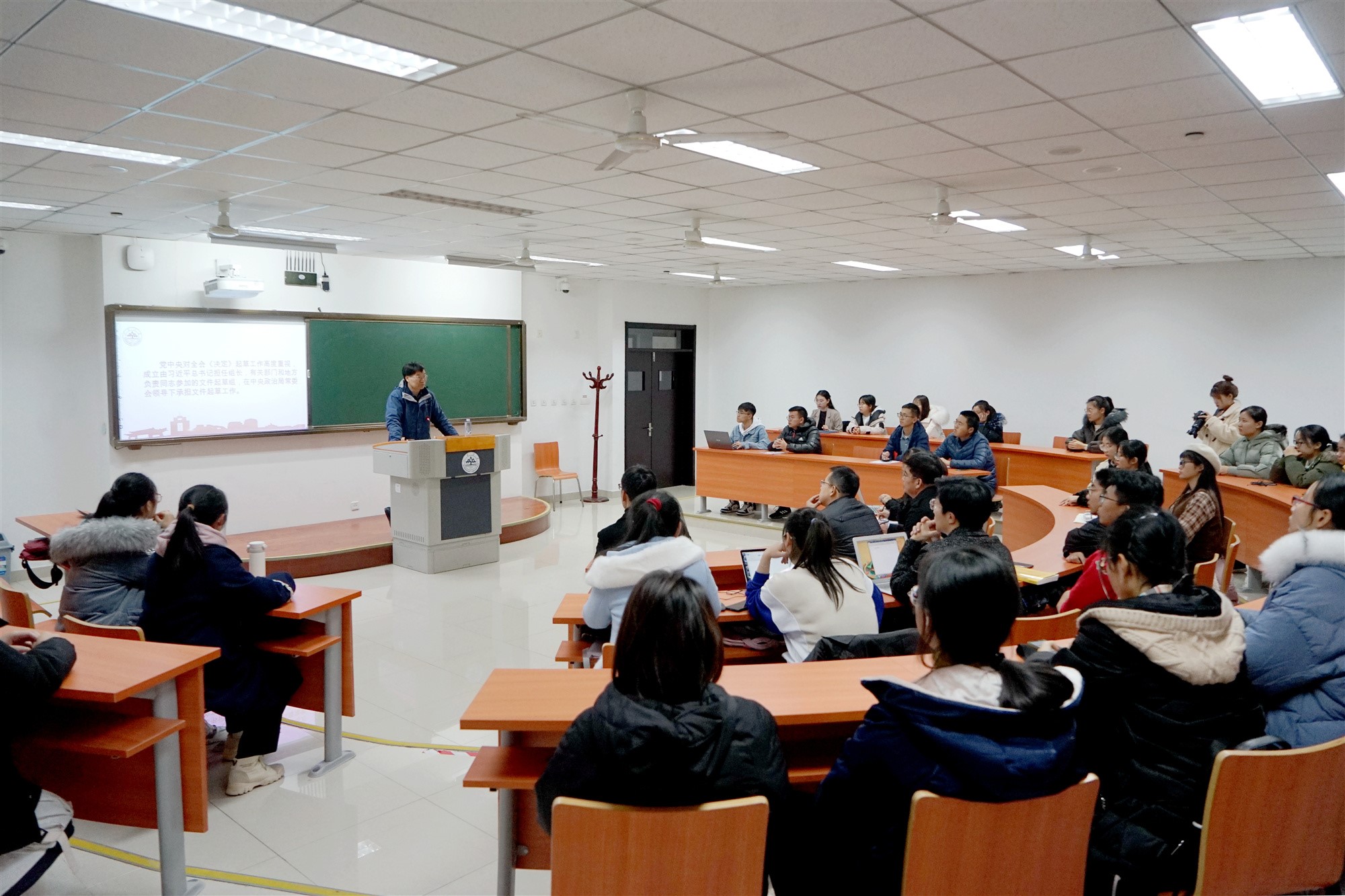 12月19日下午,青岛校区党工委书记孔令栋教授以“深入学习宣传贯彻党的十九届四中全会精神”为题,为滚球买球的app官网2019级本科政治班作了党的十九届四中全会精神专题宣讲。