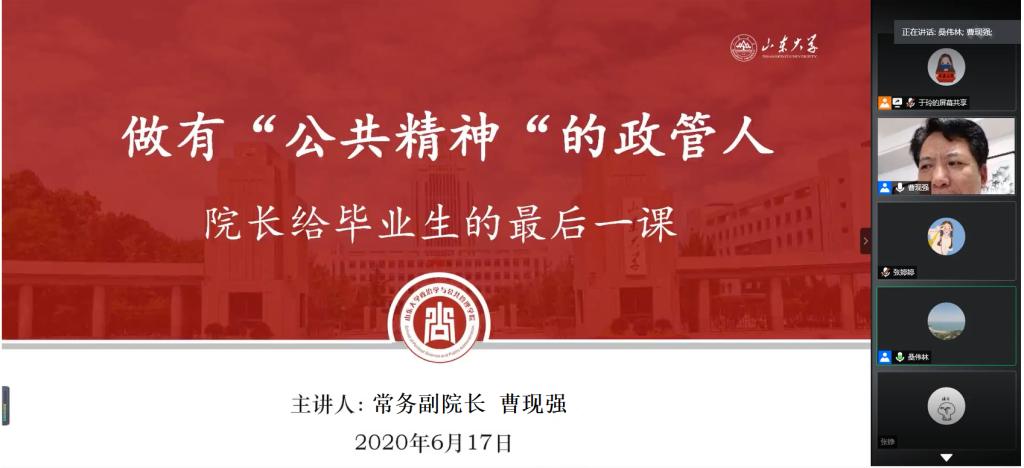 “青春‘政’好,担当以行”毕业生主题教育系列活动。学院组织开展党委书记讲党课、院长讲最后一课等主题教育系列活动,鼓励学生在毕业走向社会之时,继续发扬“知政为公,厚德笃行”的院训,增强家国情怀,社会担当和感恩意识,在国家和社会的发展中实现自己的人生价值。
