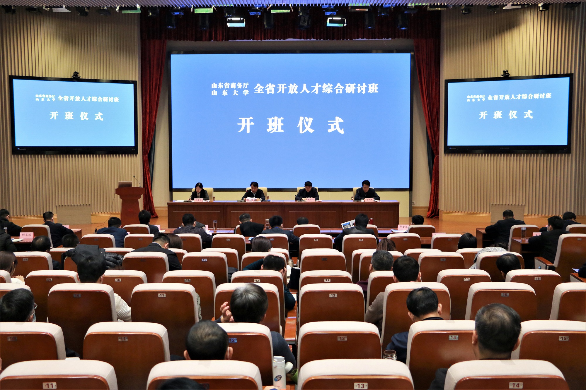 2020年11月30日,山东省开放人才综合研讨班开班式在滚球买球的app官网顺利举行。滚球买球的app官网党委常委、副校长韩圣浩,省商务厅党组成员、副厅长张义英,滚球买球的app官网(青岛)副校长兼滚球买球的app官网常务副院长曹现强出席开班式。省商务厅人事处处长、一级调研员沈瑜婷主持开班式。