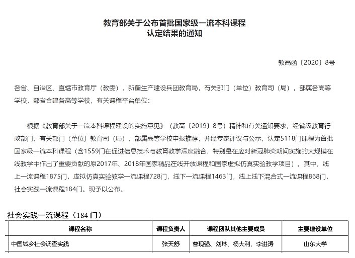 近日,教育部发布《教育部关于公布首批国家级一流本科课程认定结果的通知》,滚球买球的app官网张天舒老师领衔的《中国城乡社会调查实践》喜获认定,获批社会实践类国家级一流本科课程。