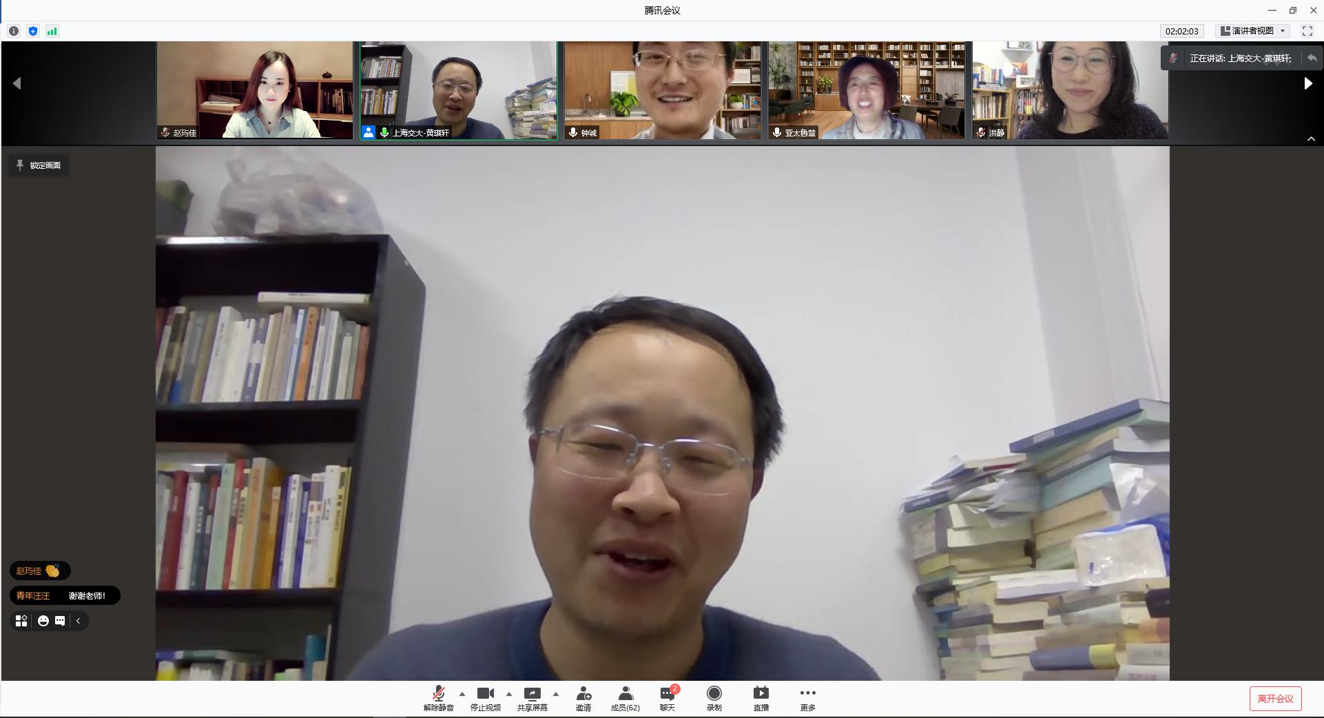 随后,讲座进入评议交流环节,各位老师围绕美国国内政治经济变迁与国际秩序的关系这一议题展开讨论。赵玙佳老师首先肯定了黄琪轩教授的研究对我们理解美国国内政治对国际秩序影响的积极意义,继而她提问道:如何从全球经济一体化的角度理解美国国内资本与产业间松散的结合关系?洪静老师也对黄琪轩教授的研究表示了肯定,她提出在当前的国际局势下,2020年美国大选仍然值得我们做进一步的深层思考;此外,她还指出,因为在哑铃型社会结构下缺乏一定的社会稳定性,未来美国的民主政治将会面临更多的挑战。