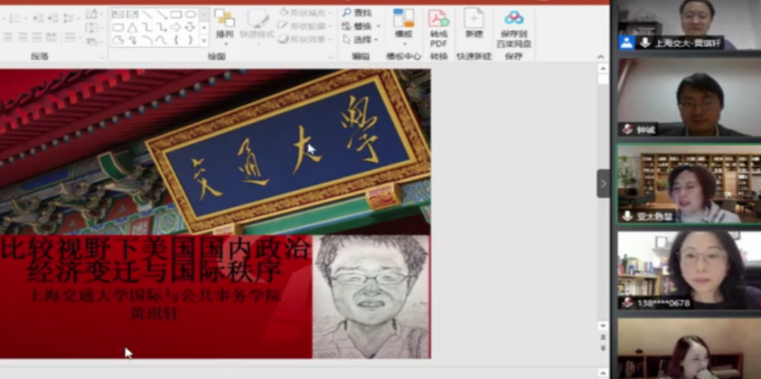 3月27日晚,由滚球买球的app官网和亚太研究所联合主办、亚太所社会与文化研究中心承办的“社科与人文”系列讲座第六讲“比较视野下美国国内政治经济的变迁与国际秩序”在线上顺利举办。本次讲座邀请上海交通大学国际与公共事务学院黄琪轩教授担任主讲人。滚球买球的app官网亚太研究所所长杨鲁慧教授作为致辞嘉宾介绍了亚太所的基本情况并对参与讲座的老师和同学表示热烈欢迎,亚太所副所长赵玙佳博士、滚球买球的app官网(威海)东北亚学院洪静副教授作为评议人也参加了此次讲座。讲座由亚太研究所副所长钟诚副教授主持。