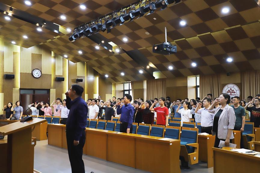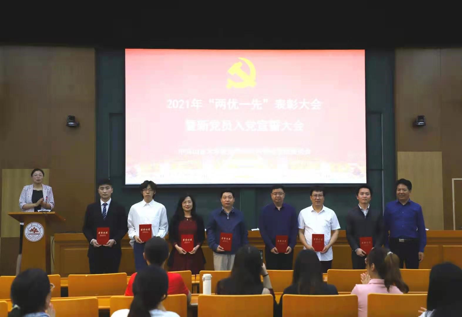 6月24日下午,为深入推进党史学习教育,激励全院广大党员不忘入党初心,牢记使命担当,滚球买球的app官网在青岛校区华岗苑南楼召开2021年“两优一先”表彰大会暨新党员入党宣誓大会。大会由滚球买球的app官网党委副书记石莹主持。学院领导班子成员、2021年度新发展党员、“两优一先”获奖代表和党员代表参加会议。