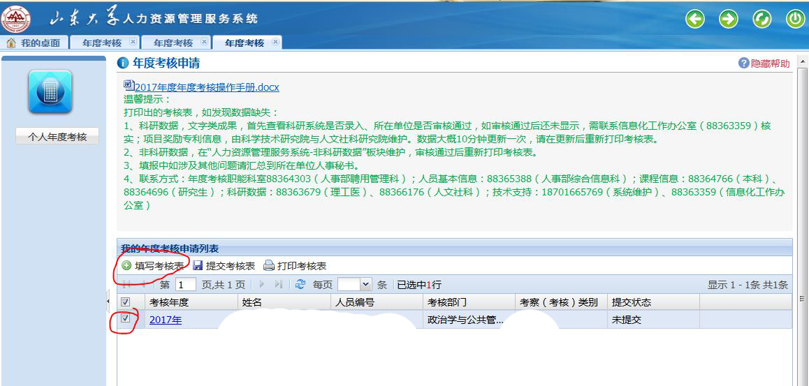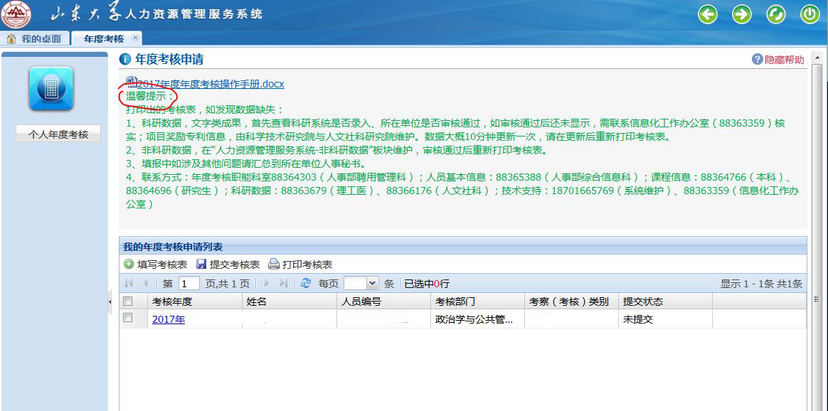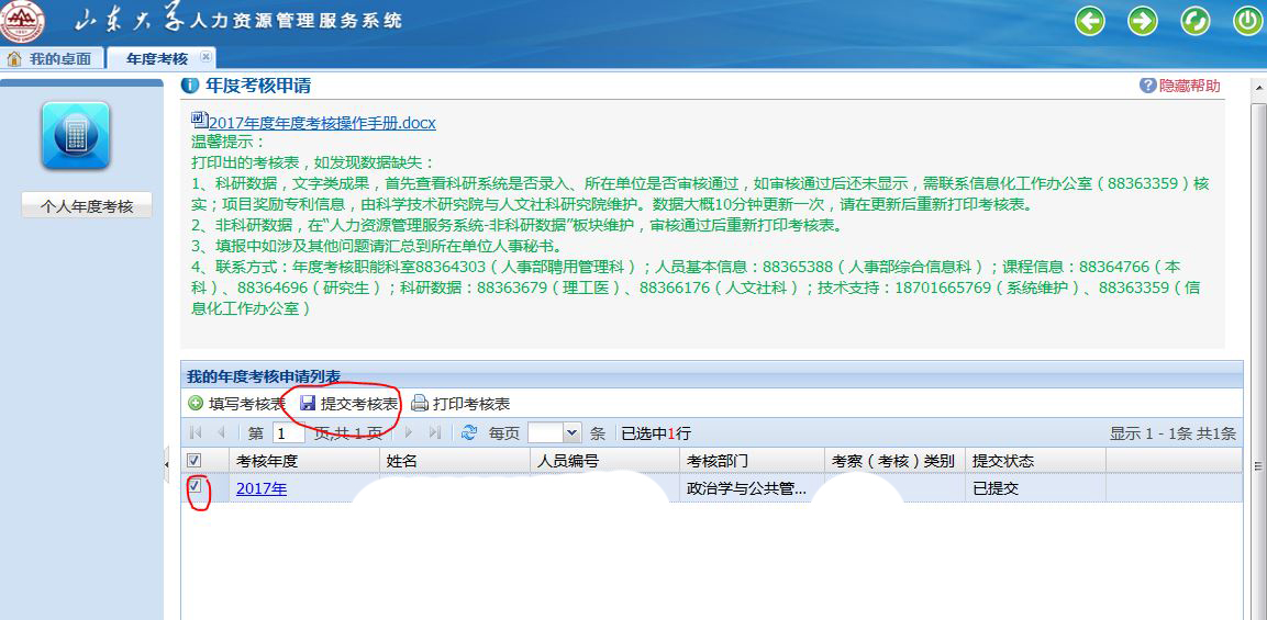 在相应考核年度那一行打钩,然后点击上面的“提交考核表”按钮,即提交至系统